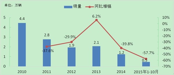 究其原因:首先與煤炭運輸市場不景氣有很大的關聯(lián)。為了能夠增加單次運輸量,業(yè)內(nèi)用去頂?shù)?2 m以下廂式半掛運輸車從事煤炭運輸服務。該部分市場,成為了2010年廂式半掛運輸車銷量的有力支撐。但近年來,我國能源結(jié)構(gòu)出現(xiàn)調(diào)整,在工業(yè)生產(chǎn)與發(fā)電方面,天然氣與非化石能源正在逐步替代煤炭,2015年1~10月,我國焦炭累計產(chǎn)量同比下滑5.1%,火力累計發(fā)電量同比下滑2.6%。加上鐵路與港口發(fā)運能力提升,以及國家對中小型煤礦的治理與關閉,我國煤炭公路運輸?shù)男枨蟠蠓南禄K?2 m以下廂式半掛運輸車市場急劇萎縮,從而導致廂式半掛運輸車市場整體銷量大幅下滑。