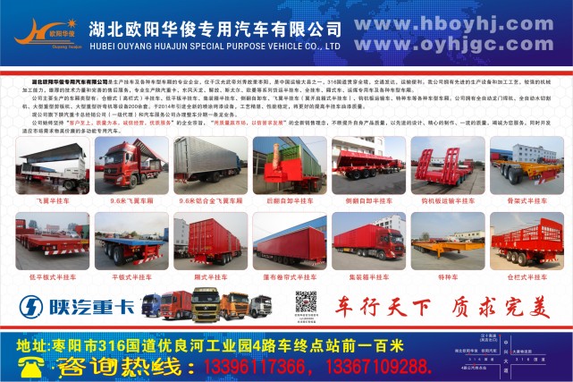 湖北歐陽華俊專用汽車有限公司(簡稱歐陽華俊)成立于2008年,總部位于湖北棗陽,公司占地面積15萬平方米,歐陽華俊是陜汽重卡一級代理,是一家集卡車車頭營銷,半掛車,全掛車,廂式車,運煤車等專用車生產制造,并提供整車分期服務的企業。