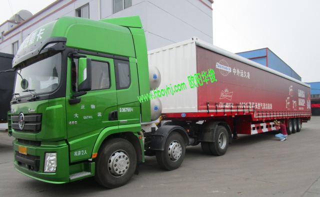 3臺蓬布側簾半掛車廂完工了,配陜汽德龍X3000 綠色LNG 400馬力牽引車漂亮!此3臺17.5米×2.8米寬超輕型低平板上裝配17.5米長蓬布側簾車廂實用,漂亮!篷布卷簾車廂尺寸為17.5米長×2.8米寬×2.4米內高,客戶自己的半掛車戶口。感謝河南袁總對歐陽華俊的支持與關注,祝袁總生意興隆,財源廣進!