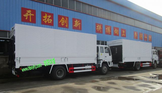 飛翼車又稱為兩翼車、翼展車、翼開啟廂式車。該車兩翼側(cè)板可升降,并有防雨、防塵、防曬、防盜、耐腐蝕等優(yōu)點(diǎn),是現(xiàn)代物流企業(yè)十分青睞的運(yùn)輸工具,具有裝卸速度快、效率高等特點(diǎn)。工作原理是通過電瓶放電經(jīng)動(dòng)力單元推動(dòng)液壓系統(tǒng)工作達(dá)到舉升的作用。舉升高度可超過車廂,接近90度角。歡迎來電咨詢:13396117366,13367109288 《湖北歐陽華俊專用汽車有限公司歡迎您!》