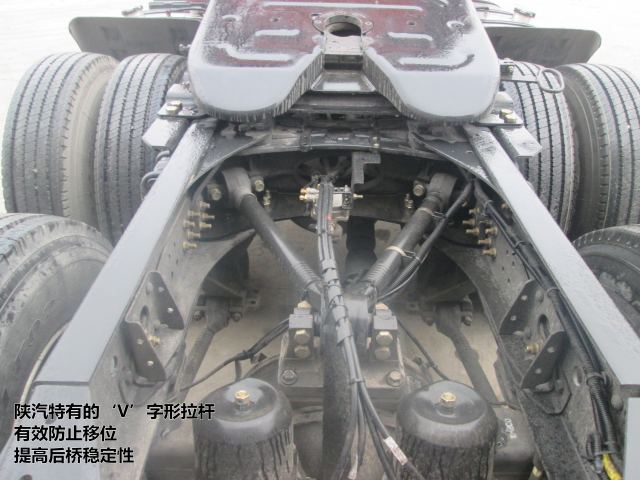 陜汽特有的‘V’字形拉桿,有效防止移位,提高后橋穩(wěn)定性。采用13T MAN單級(jí)減速后橋,速比為3.083,定位高速干線(xiàn)物流。
