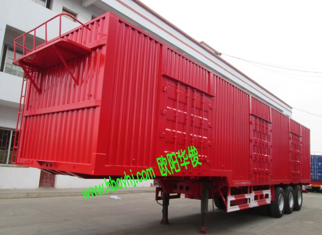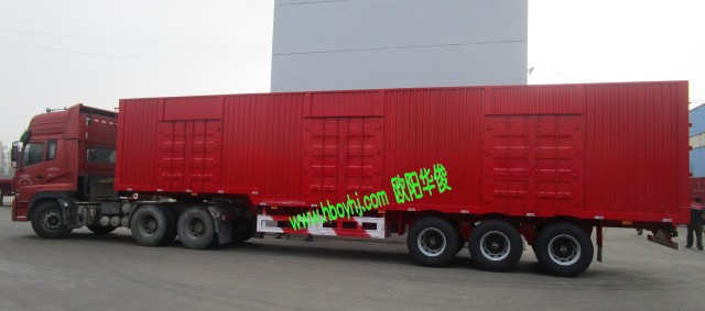 發布日期:2015-09-08 15:07:03 編輯:歐陽華俊 瀏覽量:2146下面介紹一下荊州薛總定的這臺13米3橋廂式半掛車,此廂式半掛車尺寸為:外部尺寸是13米長×2.55米寬×離地高3.8米,可做13米長2橋或3橋全封閉廂式半掛車,此車廂因為客戶拉散裝貨物的需求,高板每邊做一個對開門,低板每邊開2個對開門。這樣廂子每邊就有三對對開門了,更加能方便散裝貨物的裝卸。