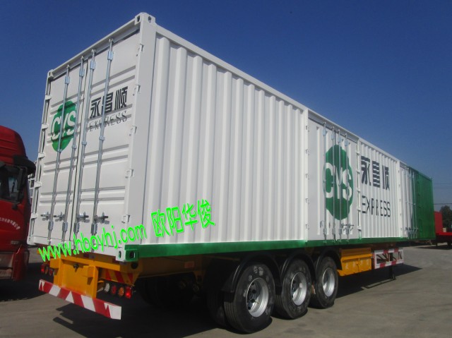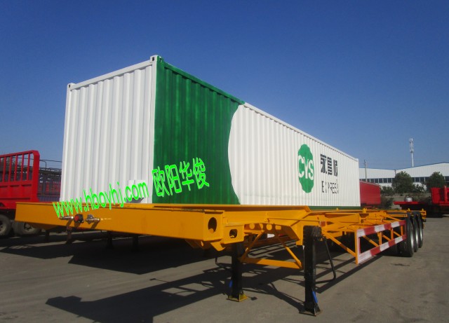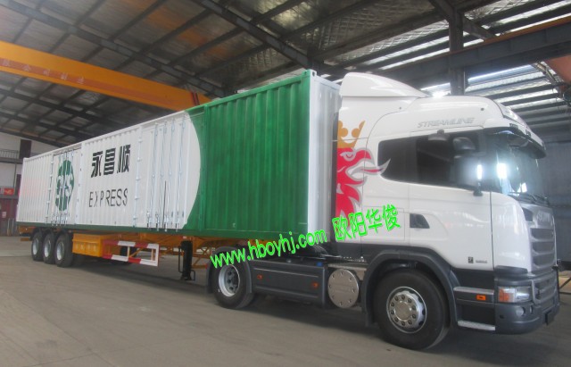 下面介紹一下趙總的這款骨架集裝箱半掛車:骨架式半掛車的尺寸為14.95米(48英尺)長×2.5米寬,白色集裝箱尺寸為16.2米長×2.7米寬×2.6米內高,外高總高4.2米。此半掛車使用的是廣州正宗的富華車橋帶ABS,集裝箱的左邊不開門,右邊開兩個門,便于貨物裝卸快捷方便。
