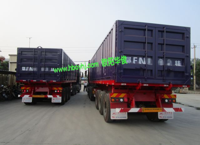 2臺全新9米后翻自卸半掛車完工交付,9米長紅色的平板半掛車配上面藍色集裝箱,漂亮!祝提車的老板們一帆風順,生意興隆!這2臺后翻自卸的尺寸為:9米長×2.5米寬,箱子的尺寸為:8.6米長×2.5米寬×1.8米高(具體以簽訂的合同尺寸為準,以上數據僅供參考)。2015年開始后翻自卸半掛車成為歐陽華俊很暢銷的車型之一,感謝親們的支持與關注。《湖北歐陽華俊專用汽車有限公司歡迎您!歐陽華俊訂車優惠熱線:13396117366,13367109288》