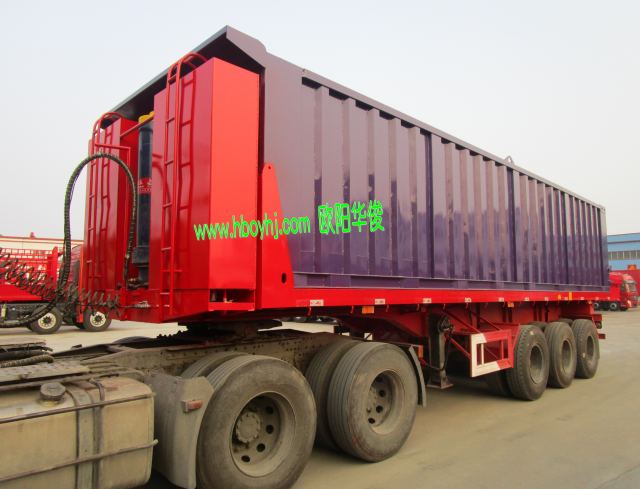 平板式集裝箱后翻自卸半掛車又稱骨架式后翻自卸半掛車,主要有8米、8.5米、9米、9.5米、10米、10.5米長的后翻自卸半掛車,滿足客戶的不同需求。后翻自卸半掛車是本公司在2015年至2016年很暢銷的一款半掛車,它具有重心低,舉升不易翻車等特點。車架用16錳梁板制成,大大增加了承載強度。重心降低至1.3米一1.4米,運貨中不上晃不易側翻,對輪胎和板簧、車架損害降低許多,深受司機朋友們的喜愛。