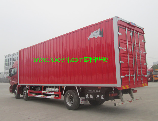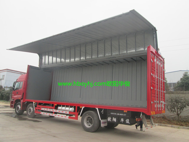 湖北歐陽華俊專用汽車有限公司生產(chǎn)的翼開啟廂式車,舉升高度可超過車廂,接近90度角。此翼開啟廂式車的尺寸為:9.6米長×2.5米寬×2.5米高,祝訂車老板生意興隆天天旺,財源廣進天天發(fā)!
