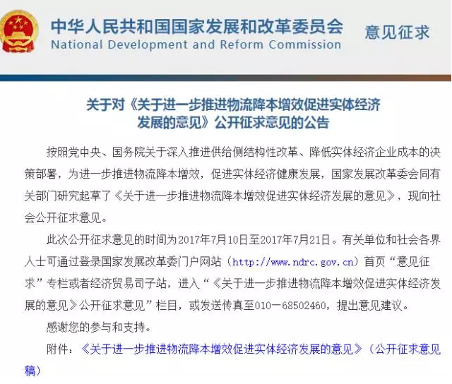 2017年下半年,國(guó)家發(fā)展改革委經(jīng)濟(jì)貿(mào)易司發(fā)布了《關(guān)于進(jìn)一步推進(jìn)物流降本增效促進(jìn)實(shí)體經(jīng)濟(jì)發(fā)展的意見》公開征求意見稿。