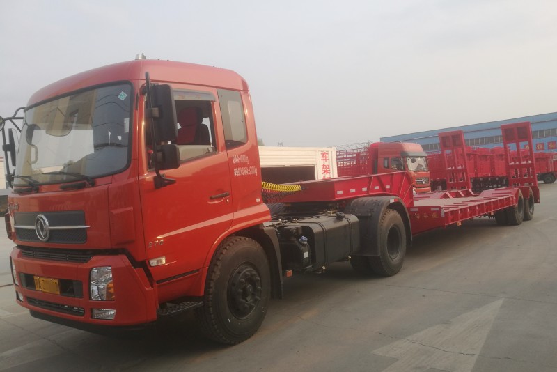 2橋的低平板半掛車后輪中間采用“U”形槽8個厚鋼板鋪好放鉤機斗,要求低于工作平臺。客戶使用的1100鋼絲胎,拉鉤機板和裝載機完全沒問題。