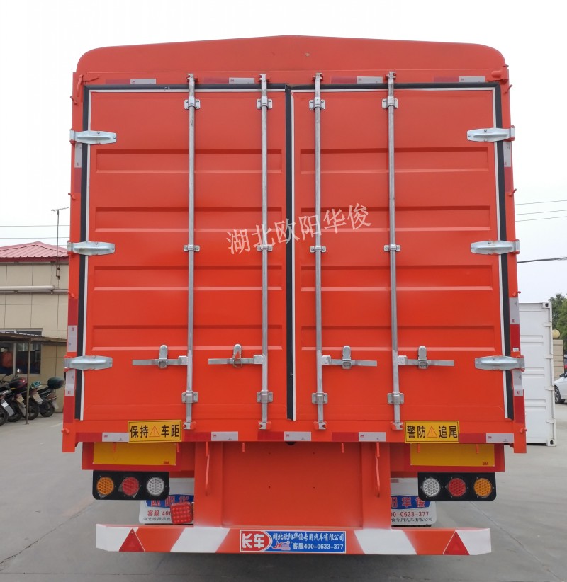 桔紅色13米蒼柵半掛車交付-歐陽華俊廠門口一道靚麗風景線