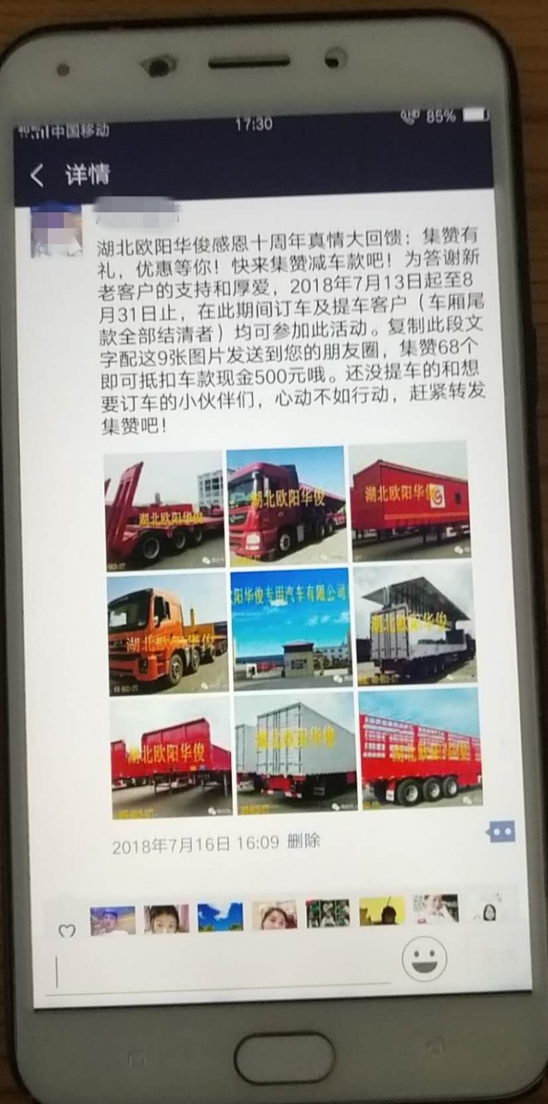 湖北歐陽華俊感恩十周年真情大回饋:集贊有禮,優惠等你!快來集贊減車款吧!為答謝新老客戶的支持和厚愛,2018年7月13日起至8月31日止,在此期間訂車及提車客戶(車廂尾款全部結清者)均可參加此活動。復制此段文字配這9張圖片發送到您的朋友圈,集贊68個即可抵扣車款現金500元哦。還沒提車的和想要訂車的小伙伴們,心動不如行動,趕緊轉發集贊吧!
