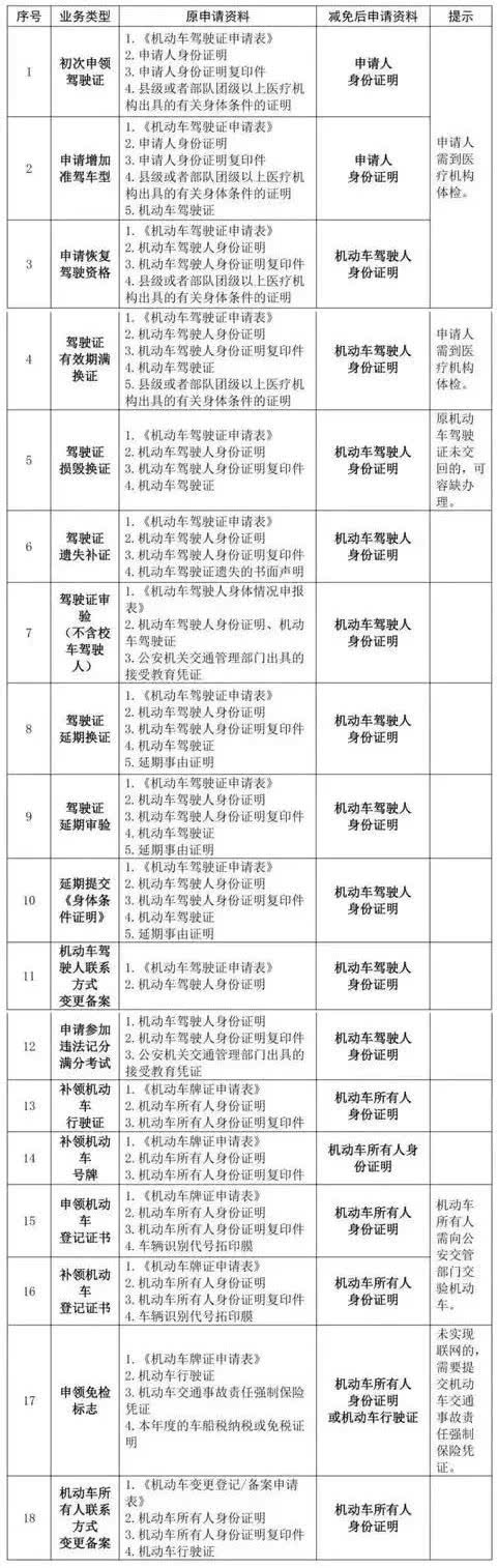 免提交:原來需要申請人提交的相關部門的證明憑證,如車輛購置稅、車船稅、交強險、報廢回收證明、醫院體檢證明等,公安交管部門將積極推進與相關部門聯網核驗,逐步取消提交紙質證明憑證。