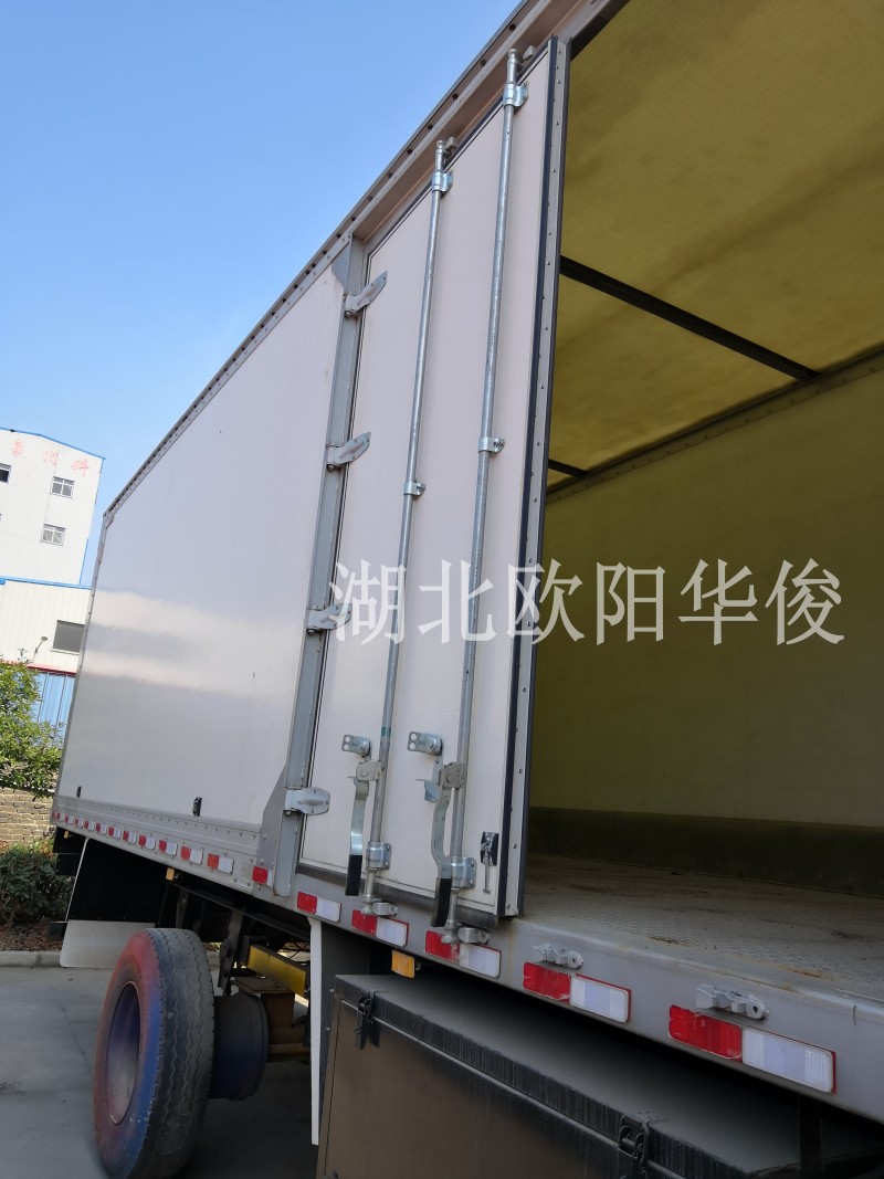 此廂式半掛車的左側為全封閉式沒有門,右側設有一對對開門,后尾一對對開門。