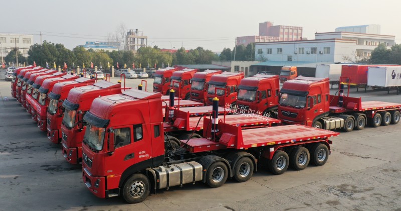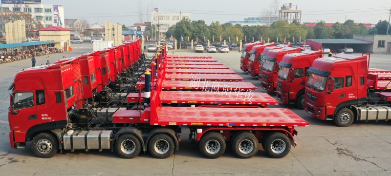 很后15臺(tái)平板自卸半掛車發(fā)車回家啦