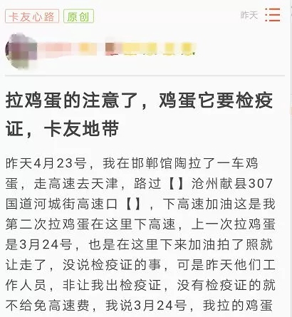 而且據(jù)拉雞蛋的卡友介紹,隨后他拉貨到天津,滄州青縣省界,天津西青,都給予免費(fèi)了,工作人員沒(méi)有提檢疫證的事。