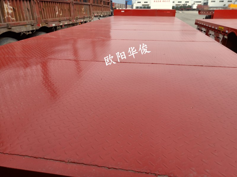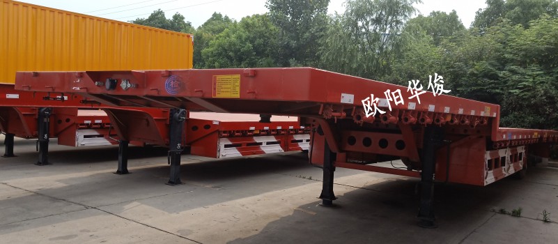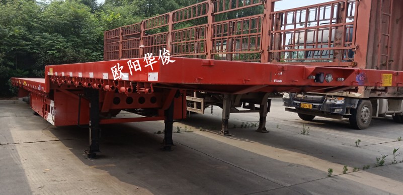 此車13.75米長(zhǎng)×3米寬,配等寬戶口一套,顏色:華俊大紅,28T單動(dòng)支腿,廣東富華13T車橋,16T剎車,板簧:10×13,底板:2.5mm花紋板,貫穿梁8#槽鋼,鋪9根底槽,可走叉車及拉重載。