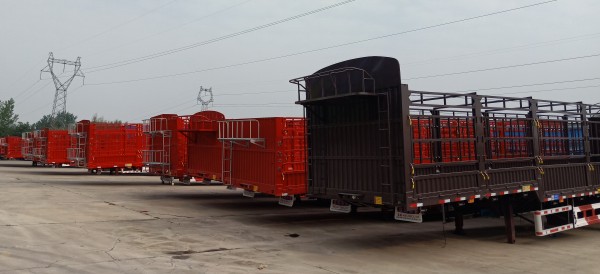 此車13.75米長×3米寬,配等寬戶口一套,顏色:華俊大紅,28T單動支腿,廣東富華13T車橋,16T剎車,板簧:10×13,底板:2.5mm花紋板,貫穿梁8#槽鋼,鋪9根底槽,可走叉車及拉重載。