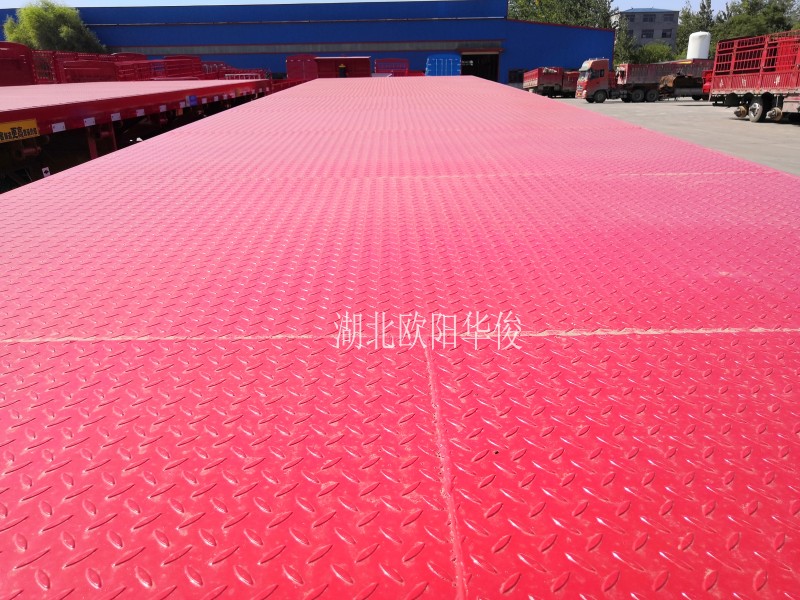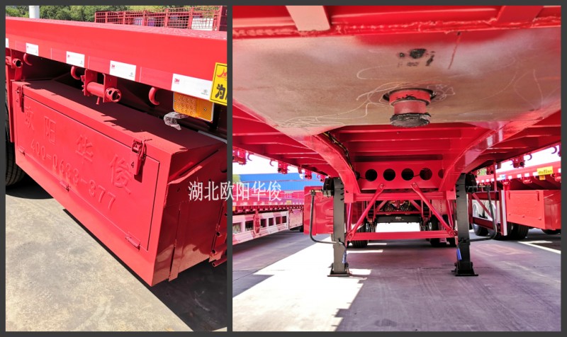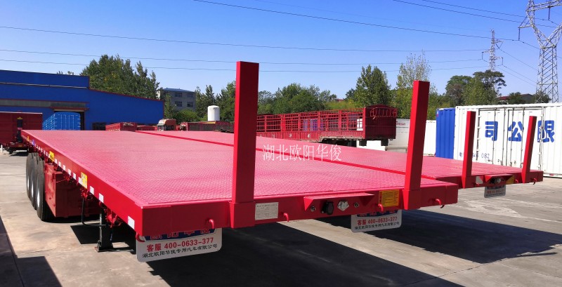 此平板半掛車尺寸為:11米長×2.55米寬。在前面設計有2根下插式活動站柱,方便客戶裝大件貨物。整車車身采用優質鋼材,先進的技術,嚴格的生產工藝制造而成,整車結構合理、性能可靠、操作簡便、外型美觀。