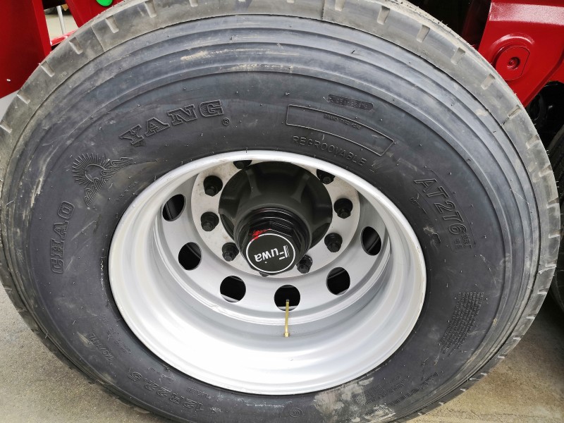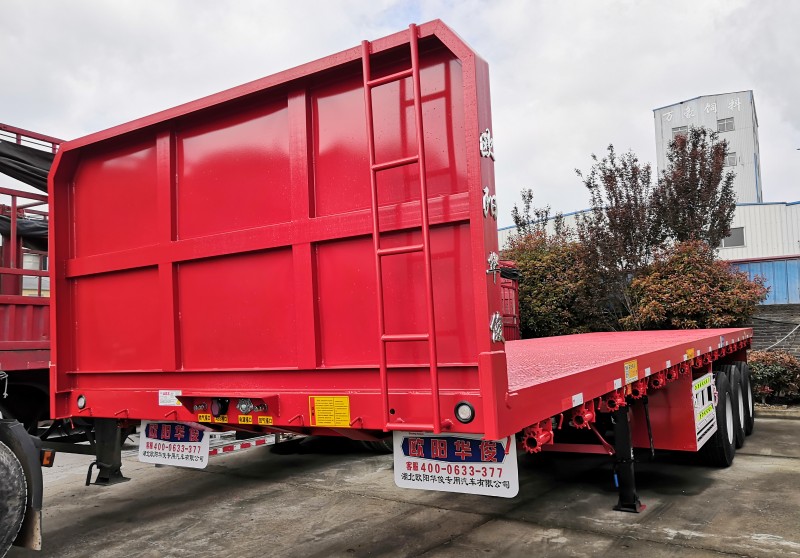 客戶呂總的標準平板半掛車尺寸為:10米長×2.55米寬。前站板用槽鋼打井字內封鐵皮,做1.2米高。用正宗廣東富華車橋帶ABS帶自動調整臂。底板用2.75厚花紋板,橫梁用80#槽鋼鋪9根5#底槽,可上叉車配置。跑短途,走山路的好幫手!