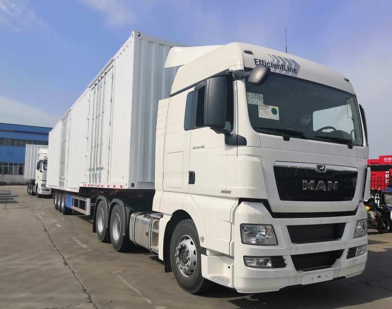 整車自重18.36噸,骨架半掛車尺寸:13.95米長*2.5米寬,集裝箱上裝的內部尺寸為:15.4米長*2.86米寬*2.93米內高。大體積將近有130立方的空間,物流公司的很愛。