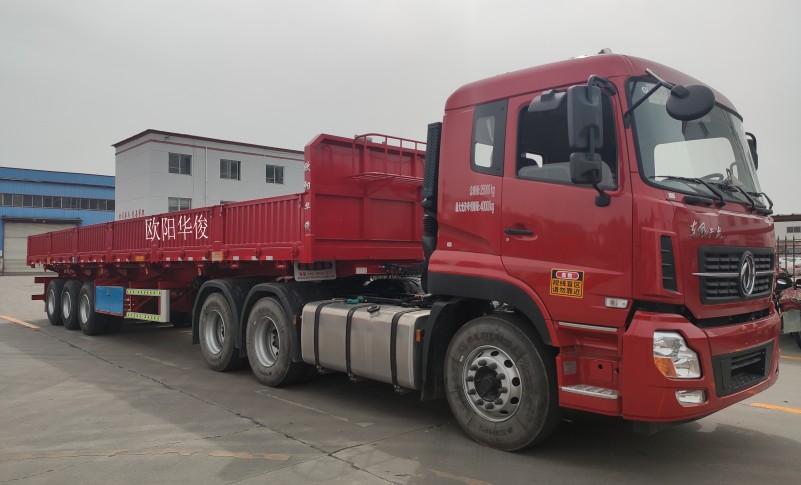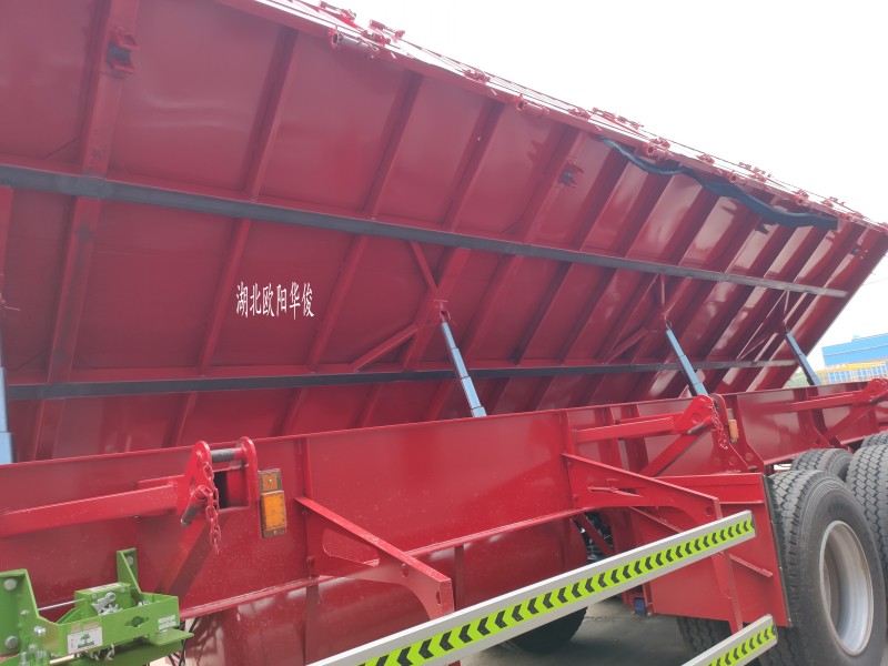 2、雙側翻結構,按客戶要求設計的可以左右兩邊翻,也可一邊翻,另一邊為正常欄板樣式,油缸舉升速度快,裝卸貨物效率高,大大節省卸料時間和勞動力,縮短運輸周期,提高生產效率,降低運輸成本。