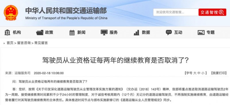 今年2月18日,交通運(yùn)輸部表明,將對(duì)從業(yè)資格證的繼續(xù)教育進(jìn)行簡化。