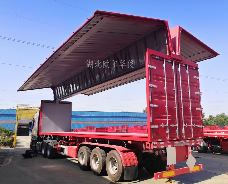 兩翼側(cè)板可升降、開(kāi)啟,且很大能夠疊放于頂板之上,使兩側(cè)部位完全敞開(kāi),極大地方便裝卸貨物,雙后門(mén)也可開(kāi)啟270度,適合機(jī)械快速裝卸,速度快,效率高,省時(shí)間,省人工。