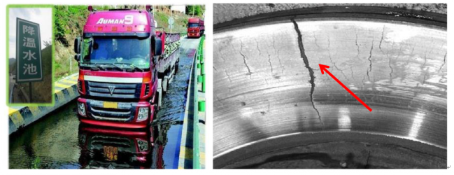 1、車輛運(yùn)行過程嚴(yán)禁采用淋水器對(duì)制動(dòng)盤進(jìn)行淋水降溫,否則極易造成制動(dòng)盤貫穿性開裂,制動(dòng)失效。