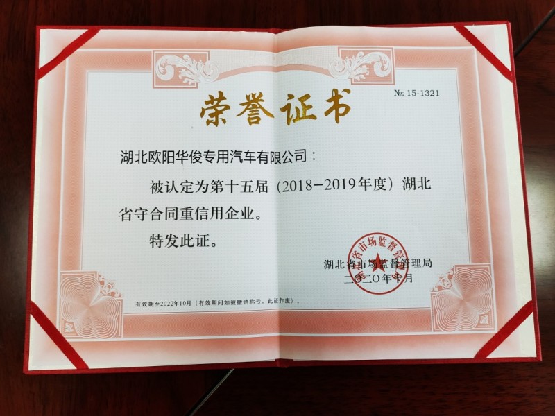 發布日期:2021-01-06 03:08:49 編輯:歐陽華俊 瀏覽量:2531湖北省市場監督管理局對“守合同重信用”企業開展了綜合評定機制,從品牌的社會影響力、合同信用管理體系、合同行為、合同履約狀況、經濟效益、社會信譽等多方面進行評選,湖北歐陽華俊專用汽車有限公司被認定為第十五屆(2018-2019年度)湖北省守合同重信用企業,并為企業頒發榮譽證書。
