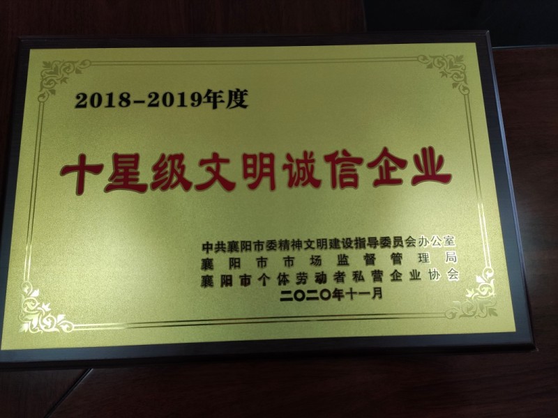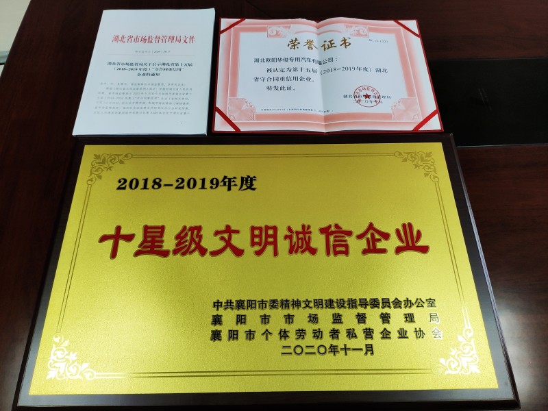 根據襄陽市精神文明建設工作的總體要求,為充分發揮“十星級”先進典型的示范引導作用,進一步動員和激勵廣大個體戶、企業積極參與文明誠信建設,襄陽市市場監督管理局對2018-2019年度“十星級”文明誠信個體戶、文明誠信企業創建單位進行申報評審,湖北歐陽華俊專用汽車有限公司榮獲(2018-2019年度)襄陽市“十星級”文明誠信企業。