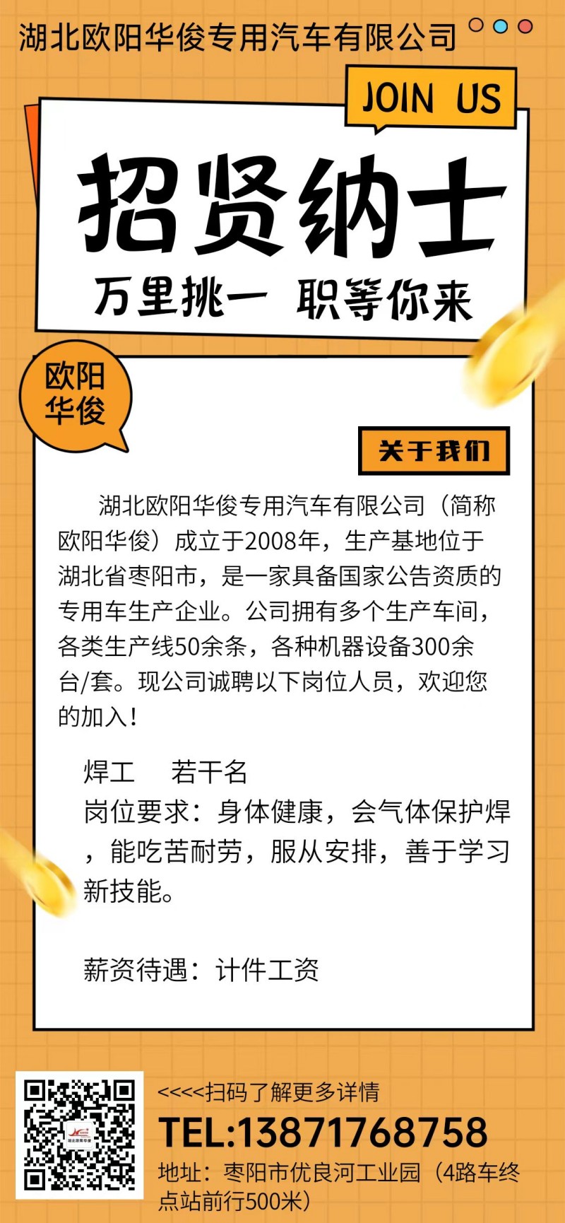 湖北歐陽華俊誠聘專業焊工,歡迎加入我們 發覺你的光彩
