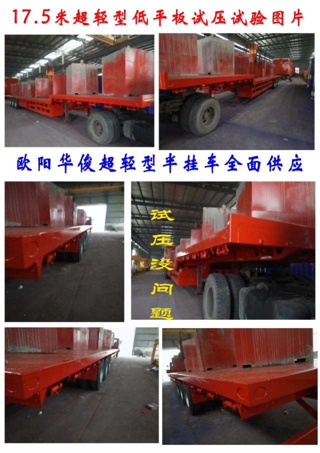 自歐陽華俊推出超輕型低平板半掛車以來,深受廣大司機朋友們的關注,咨詢量及訂車對換的客戶越來越多。現公布一下超輕型半掛車(低平板半掛車和倉欄半掛車)的試壓試驗圖片。我們的超輕型半掛車在客戶提車時由我們的檢驗人員進行質量檢驗,讓大家放心裝貨,多掙錢回家。
