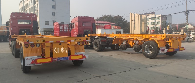 歐陽華俊45英尺黃色三軸骨架半掛完工批量交付湖北客戶啦!此骨架半掛車的尺寸為:13.95米長×2.55米寬,本公司生產的骨架式半掛車采用很佳的設計方案,結構合理,操作可靠,外觀優美,上面可配集裝箱,罐子類使用,發揮整車的很大潛能。 本